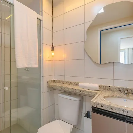 Apartamento Mirante #905 - Fortaleza Por Carpediem está equipado com uma banheiro que inclui secador de cabelo, lençóis de banho e toalhas.